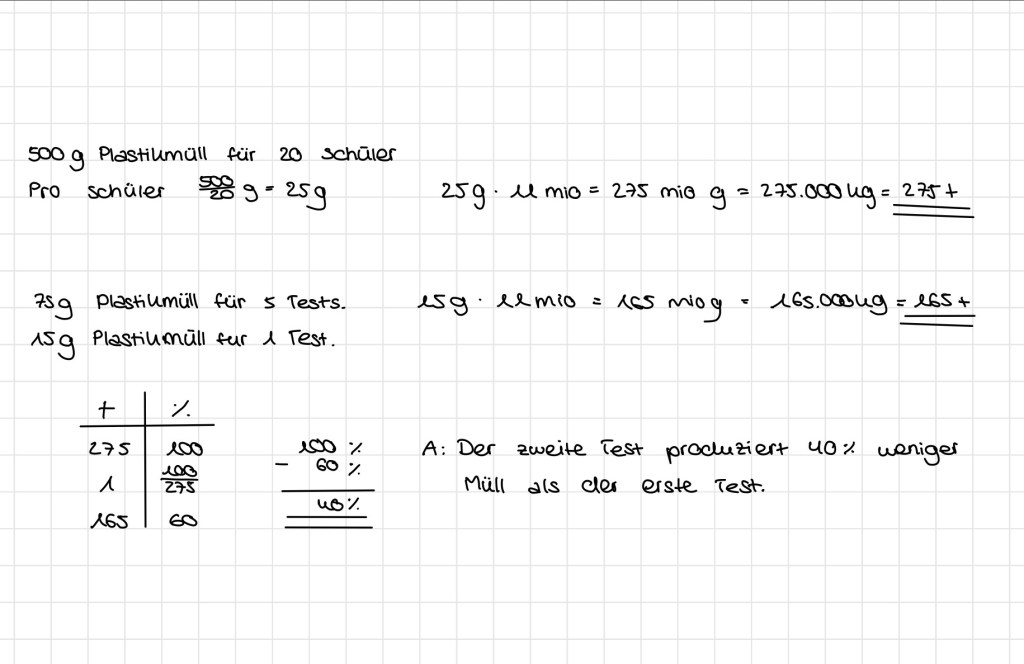 Im Gegensatz dazu haben die alten Tests etwa 15 g Müll pro Schüler:in produziert. Die 8er haben ausgerechnet: Das sind 40% weniger!