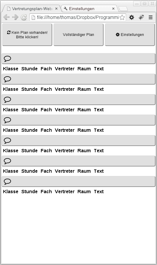 Die App meldet, dass der aktuelle Plan noch nicht geladen wurde. Ein Klick auf den Button oben links lädt den aktuellen Plan und die App findet automatisch alle Vertretungen, die mich betreffen: