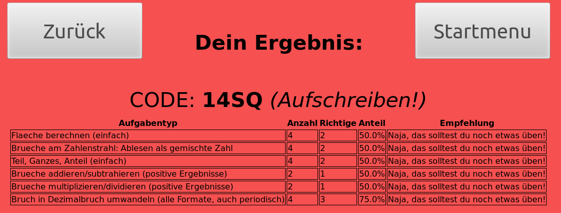 - Wenn du alle Aufgaben bearbeitet hast, wird dir angezeigt, wie gut du bei den einzelnen Aufgaben warst. Den angezeigten Code musst du abschreiben und in die in der Schule ausgehängte Liste eintragen.